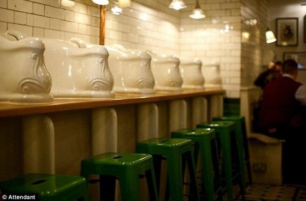 Usted puede llegar al local y sentarse frente a uno de los antiguos mingitorios originales fabricados en 1890 por la Doulton & Co, que ahora fungen como gabinetes individuales. Donde antes yacían los orines, ahora los clientes colocan sus pies.