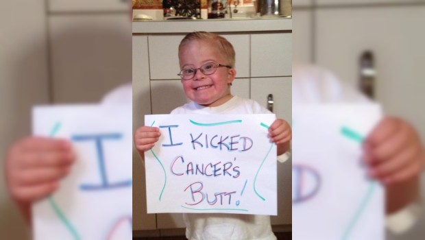 Un niño con Síndrome de Down porta un cartel que anuncia: "¡le pateé el trasero al cáncer!".
