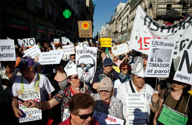 Miles de españoles se manifestaron el domingo con motivo del segundo aniversario del movimiento de los indignados, en medio de un desempleo récord y un histórico programa de austeridad.