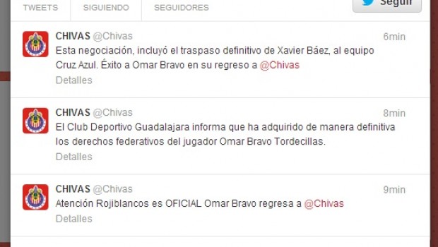 “El Club Deportivo Guadalajara informa que ha adquirido de manera definitiva los derechos federativos del jugador Omar Bravo Tordecillas”, agregó el mensaje difundido en dicha red social.