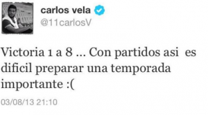 Tras la victorias por 12-0, 7-1 y 8-1 ante rivales de categorías muy inferiores, Carlos Vela público en su cuenta Twitter. “Victoria 1 a 8… Con partidos así es difícil preparar una temporada importante”.