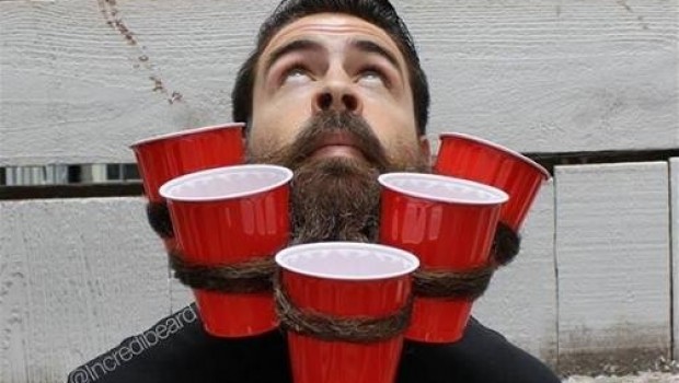 Pero la barba de este hipster no sólo sirve para contener sopa, también puede sostener vasos para tus bebidas favoritas.